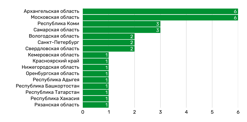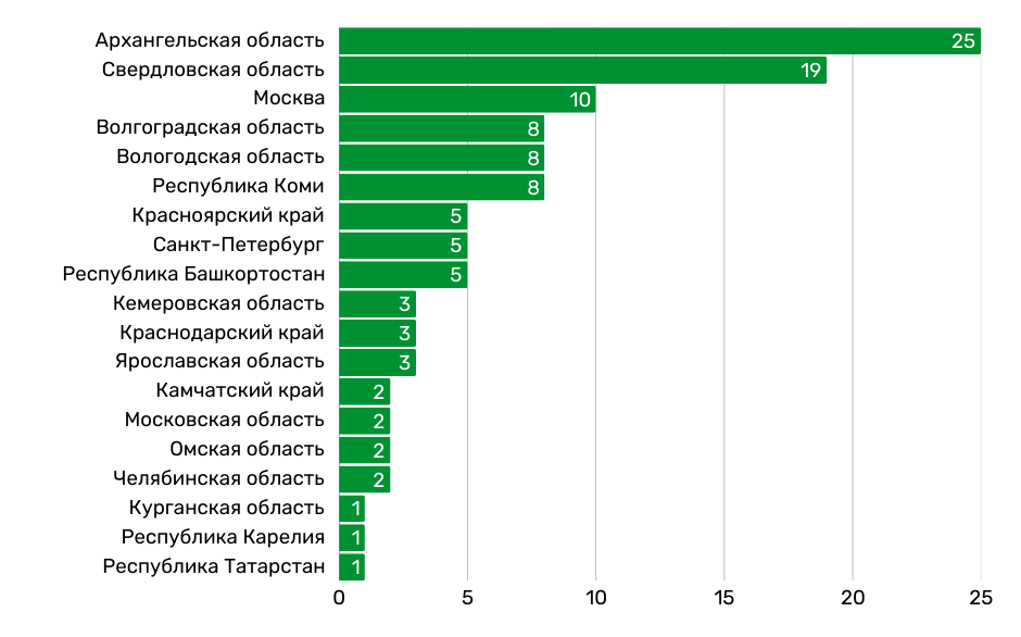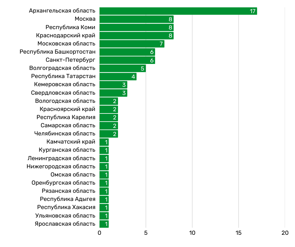 Давление на экоактивистов за высказывание несогласия с СВО зафиксировано в 27 регионах России. Регионами-лидерами по числу случаев давления являются: Архангельская область (17 активистов), Республика Коми (8 активистов), Москва (8 активистов).