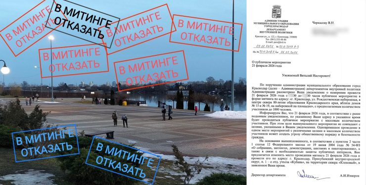 • С 4 по 27 февраля 2026 г. жители Юбилейного микрорайона Краснодара сообщили о 23 новых отказах в согласовании митинга против застройки набережной и изменения статуса рекреационной зоны. Митинги с планируемой численностью участников до 1000 человек заявлялись в сквере 80-летия образования Краснодарского края и на других площадках микрорайона. В качестве причины отказа в согласовании митингов каждый раз сообщалось, что якобы по указанному адресу в указанное время будет проводиться другое «публичное мероприятие с массовым количеством участников». По словам жителей, никаких публичных мероприятий в сквере в эти дни не проходило. В своих ответах мэрия предложила жителям проводить  митинги в микрорайоне Учхоз Кубань, куда из Юбилейного даже не ходит общественный транспорт. 9 февраля 2026 г. экоактивисты сообщили в Телеграм-канале, что власти Краснодара отказали им в согласовании уведомлений, поданных на 16-20 февраля. Позже в этот же день инициативная группа получила еще два отказа – о согласовании митингов в субботу 21 февраля и в воскресенье 22 февраля.  21 февраля 2026 г. экозащитники сообщили о получении 20-го отказа администрации Краснодара в согласовании митинга. 27 февраля 2026 г. мэрия в 26-й раз отказала жителям согласовать проведение на территории Юбилейного микрорайона митинга против застройки набережной. Из 26 отказов три были получены ранее, в октябре 2025 г.